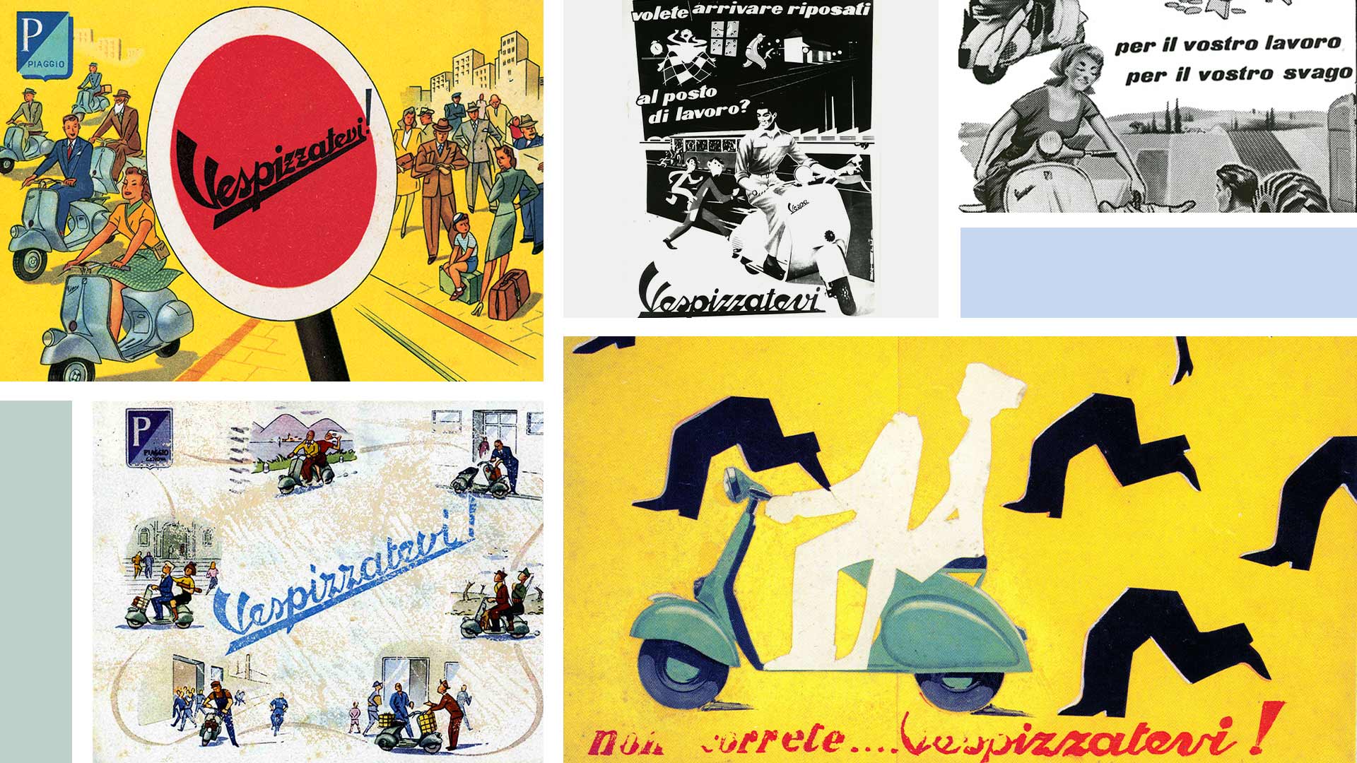 在1950年代初期,“Vespizzatevi!”这句广告标语从一个专有名词变成一个动词,被视为一种行动呼吁,大家把这个当作是一种行动的号召,将Vespa定位为一个有助于降低污染的交通替代方案。当时被视为一项最新的概念,之后国际BBH广告公司将之重现,推出了一个名为“我们Vespa (Vespa ourselves)”的现代广告活动。这项传奇行动的复兴还是以自由为中心,它不仅是一种交通工具,更是激发骑乘者大声喊出“Live more Vespa!” 的一种心态!