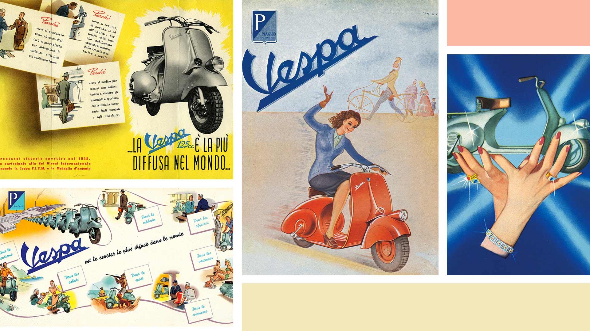 看着第一辆踏板车原型车(MP6)婀娜多姿的车身曲线,聆听着它98cc发动机发出来的嗡嗡声,Enrico Piaggio忍不住惊呼:“它听起来像一只黄蜂(黄蜂的意大利语为Vespa)!”这句话开启了一场广告革命,影响力遍及全球,并成为数个经典广告活动的基底。