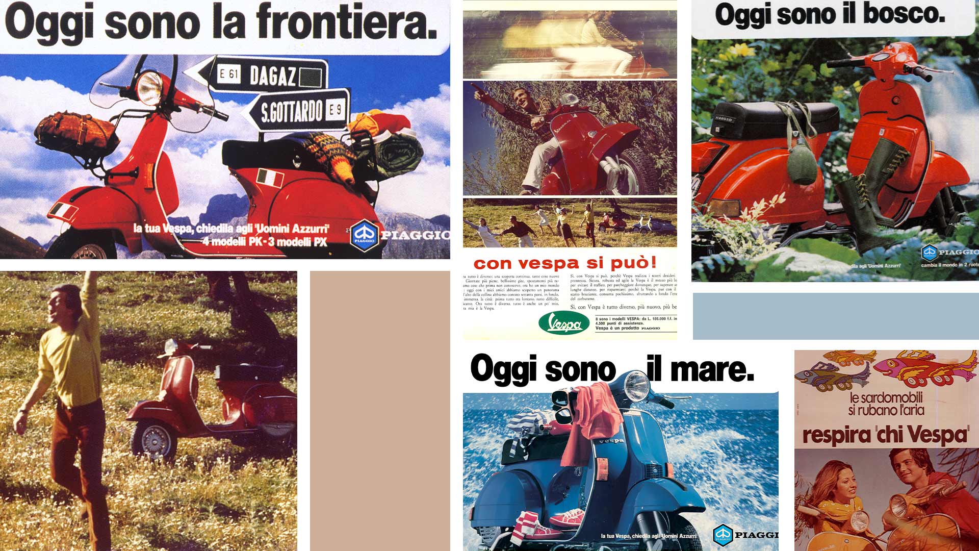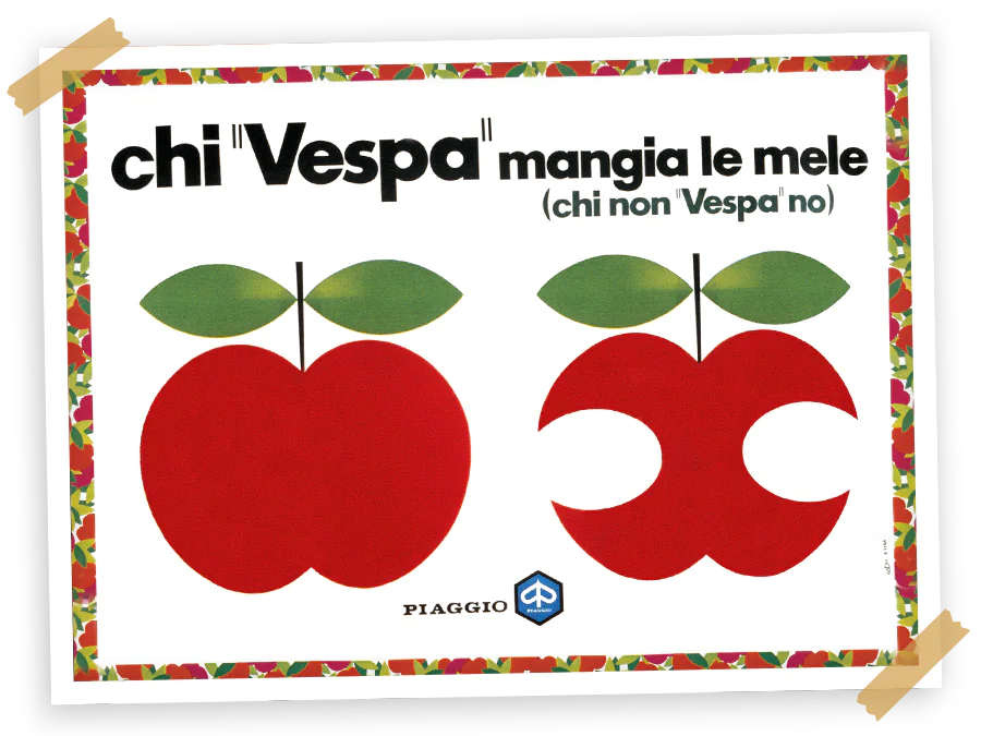 Vespa的广告活动还表达了反对汽车拥堵以及千篇一律。广告活动传达出骑乘Vespa是缓解对城市感到乏味的特殊良药,并用一种前所未见的手法将Vespa与自然连结在一起,创造出许多著名的广告标语,如Vespizzatevi(1950-1954),Con Vespa si può(1968),以及著名的Chi vespa mangia le mele(1969-71)。