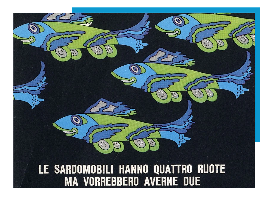 然而正是在环保意识兴起的1970年代,才真正见到Vespa最有名、最具代表性的广告活动之一:Gilberto Filippetti对汽车的昵称”沙丁鱼汽车(sardomobili)”,无伤大雅地取笑汽车发出的躁音,不如Vespa那么安静。