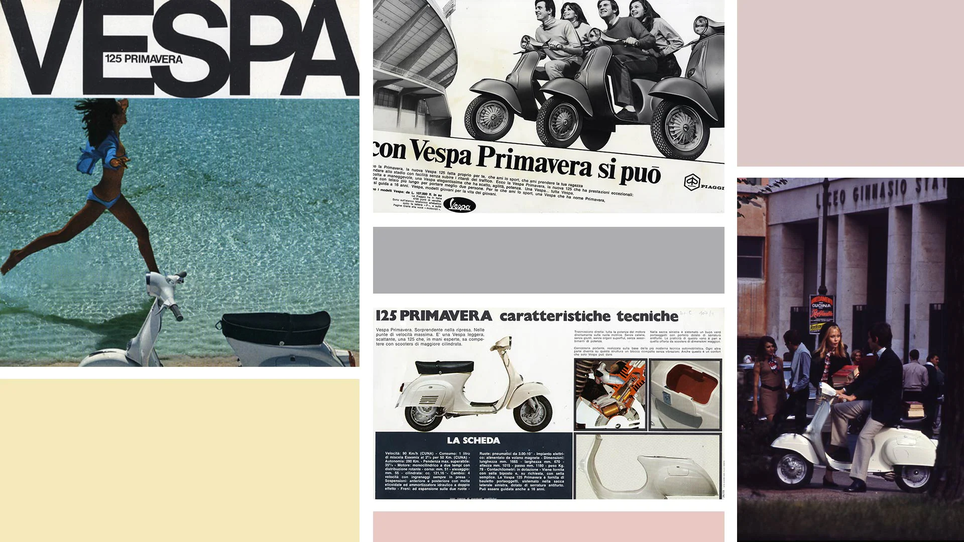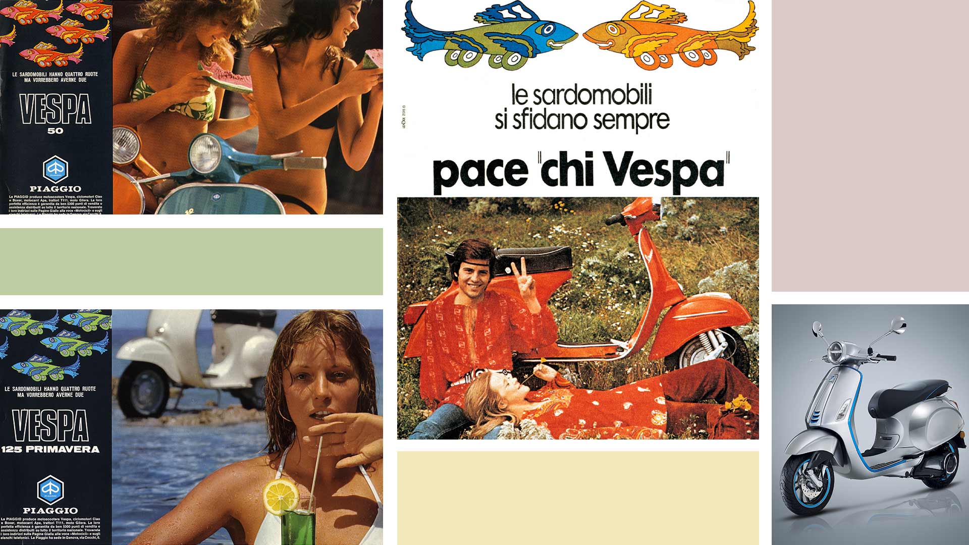 1972年推出了生动的“四轮沙丁鱼汽车”广告活动,画面上见到堆叠的汽车塞满道路,“享受不到阳光”、“呼吸不到新鲜空气”、“总是很拥挤”、“大声鸣笛”、“总是在赶时间”;另一方面那些“骑乘Vespa的人”持续不断的超过开车的人:他们“闪闪动人”、“享受新鲜空气”、“歌颂和平”、“互相尊重”、“轻声细语”而不是“大喊大叫”,以及“第一个抵达”。广告内容传达出整个空间被四轮沙丁鱼汽车占据,这不只发生在海报上,也发生在现实生活中:整个城市与道路被汽车占据,造成空气污染,制造躁音。在2018年,Vespa Elettrica成为安静、骑行乐趣和高品质生活的代名词。它表明,选择Vespa首先意味着是对于美学的承诺、以及对不落俗套的确信。